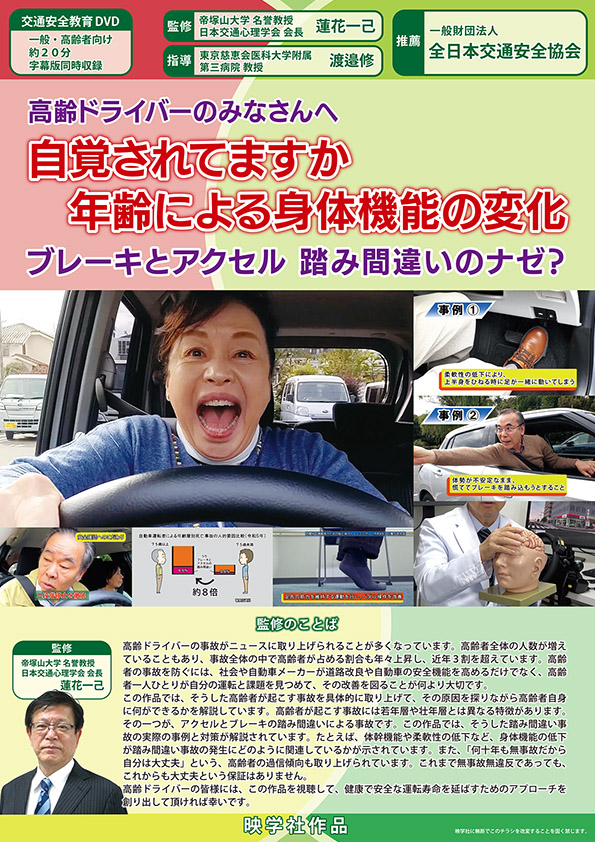 一般・高齢者向けDVD(字幕版同時収録) 20分・2018年 一般財団法人日本交通安全教育普及協会推薦 第60回科学技術映像祭部門優秀賞 2019年教育映像祭優秀作品賞 本体価格65,000円(税込71,500円) |